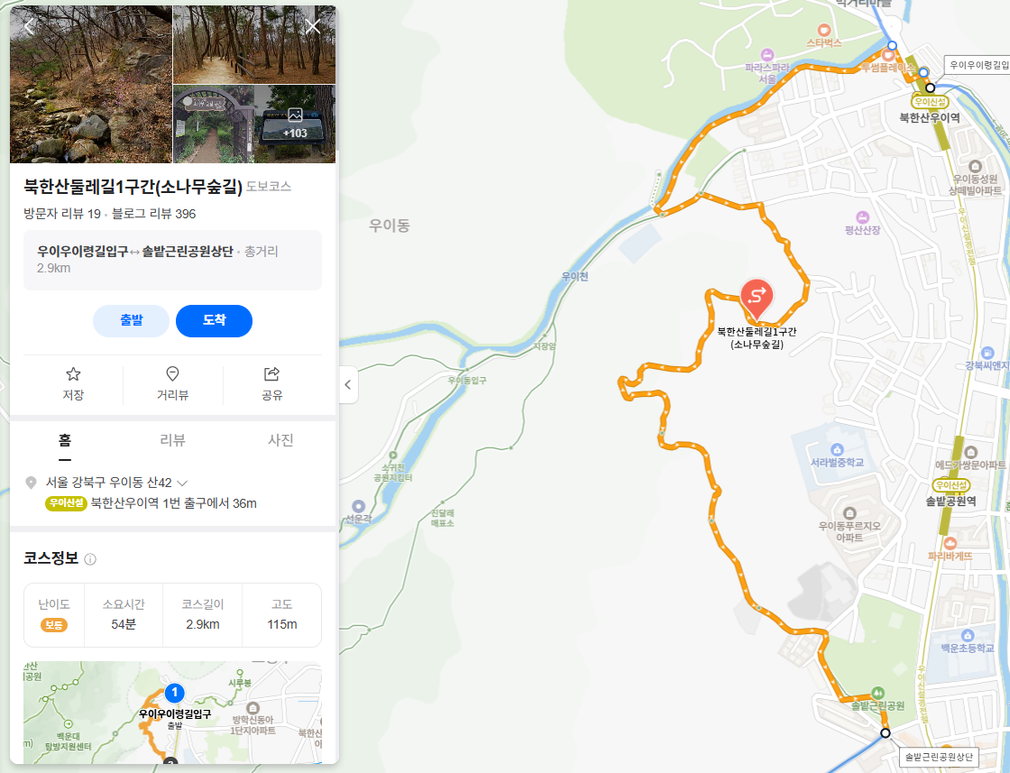 지하철: 우이신설선 솔밭공원역 2번 출구에서 북한산둘레길 1코스 시작점(탐방안내센터)까지 도보로 약 10분 소요됩니다.