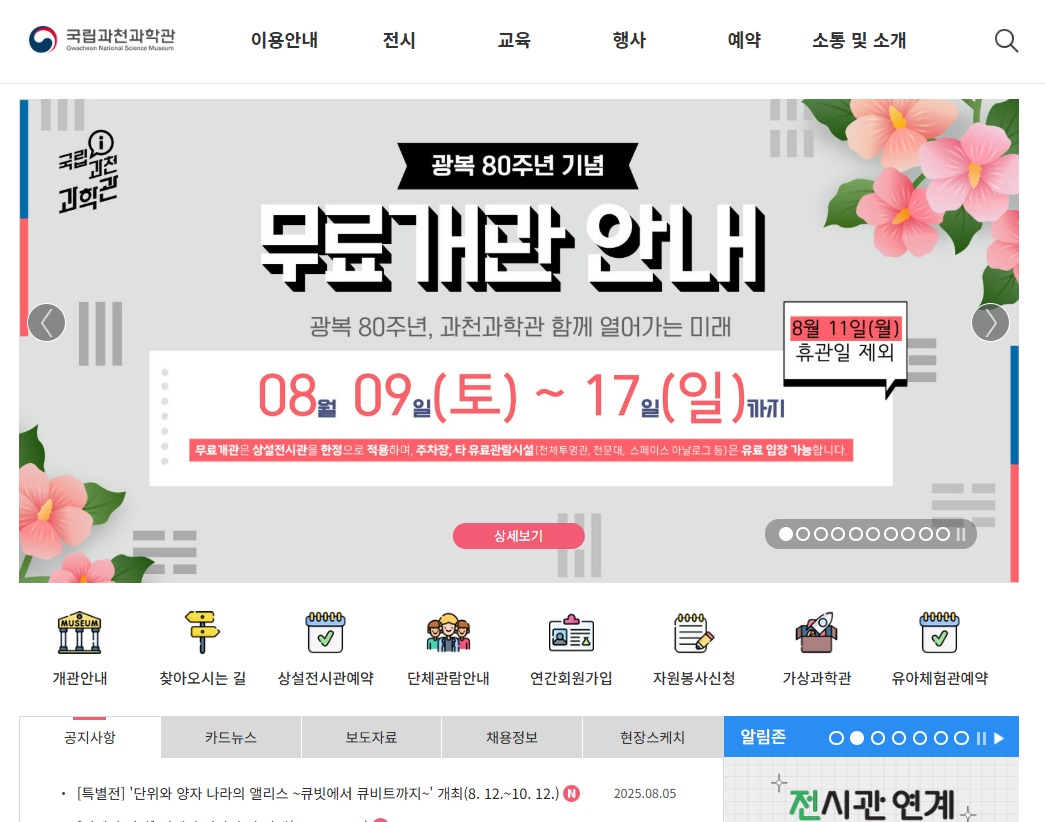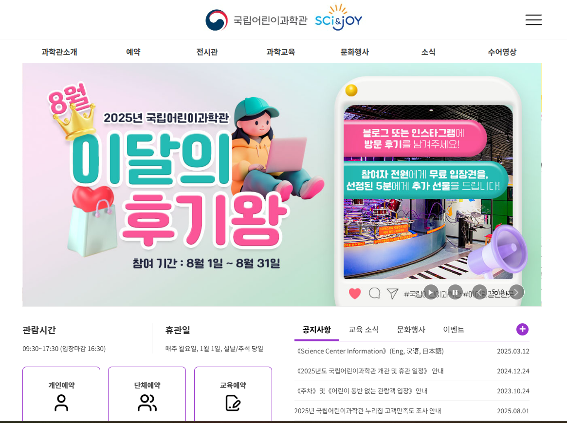 - 국립어린이: 전시관 2개, 체험 중심 구성. 천체투영관, 4D 영상관 등 변경 기능 있음.