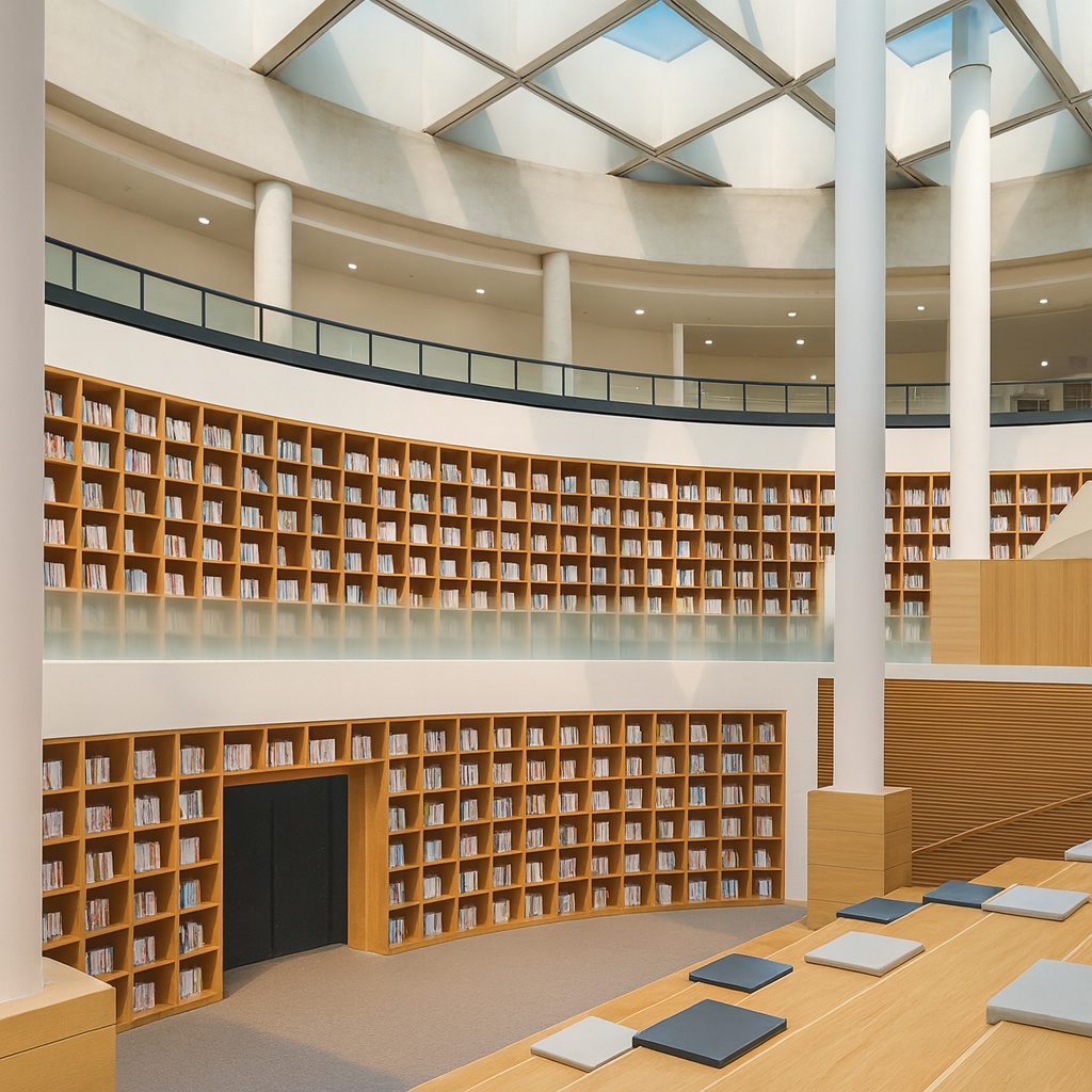 도서관 외관: 현대적이면서도 따뜻한 분위기의 건물 전경
