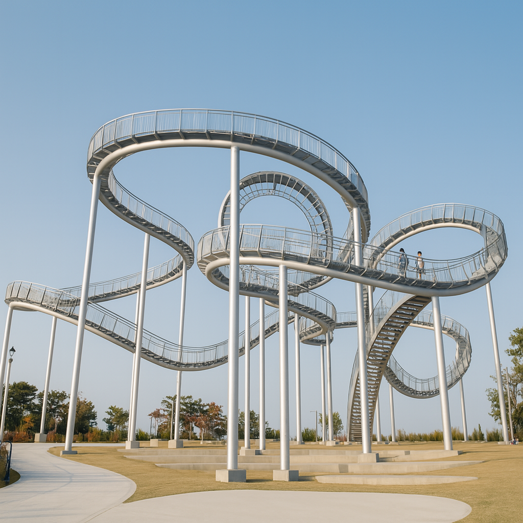 포항 스페이스워크(Space Walk)는 국내 최초이자 유일한 공중 조형물형 산책로입니다. 거대한 롤러코스터 철골 구조 위를 직접 걸을 수 있도록 설계되어 있으며, 위에서 내려다보는 포항 도심과 영일만 바다는 장관입니다.