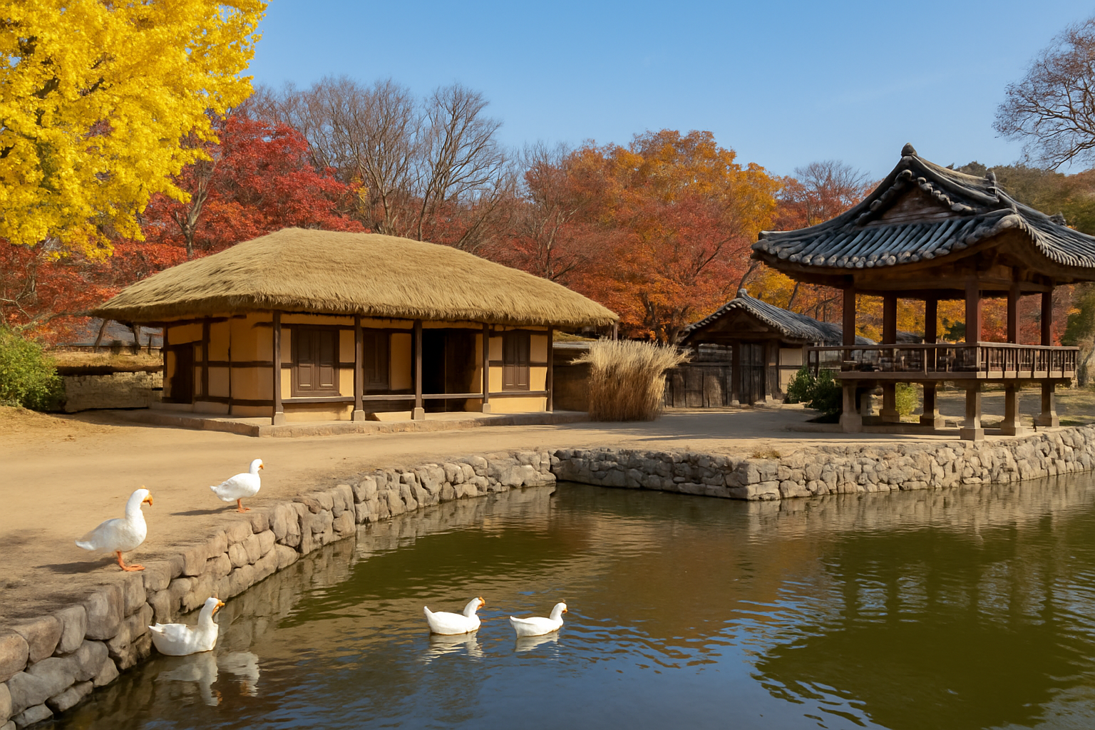 - 연못 주변 초가집 – 연꽃과 수련이 어우러진 전통 정원